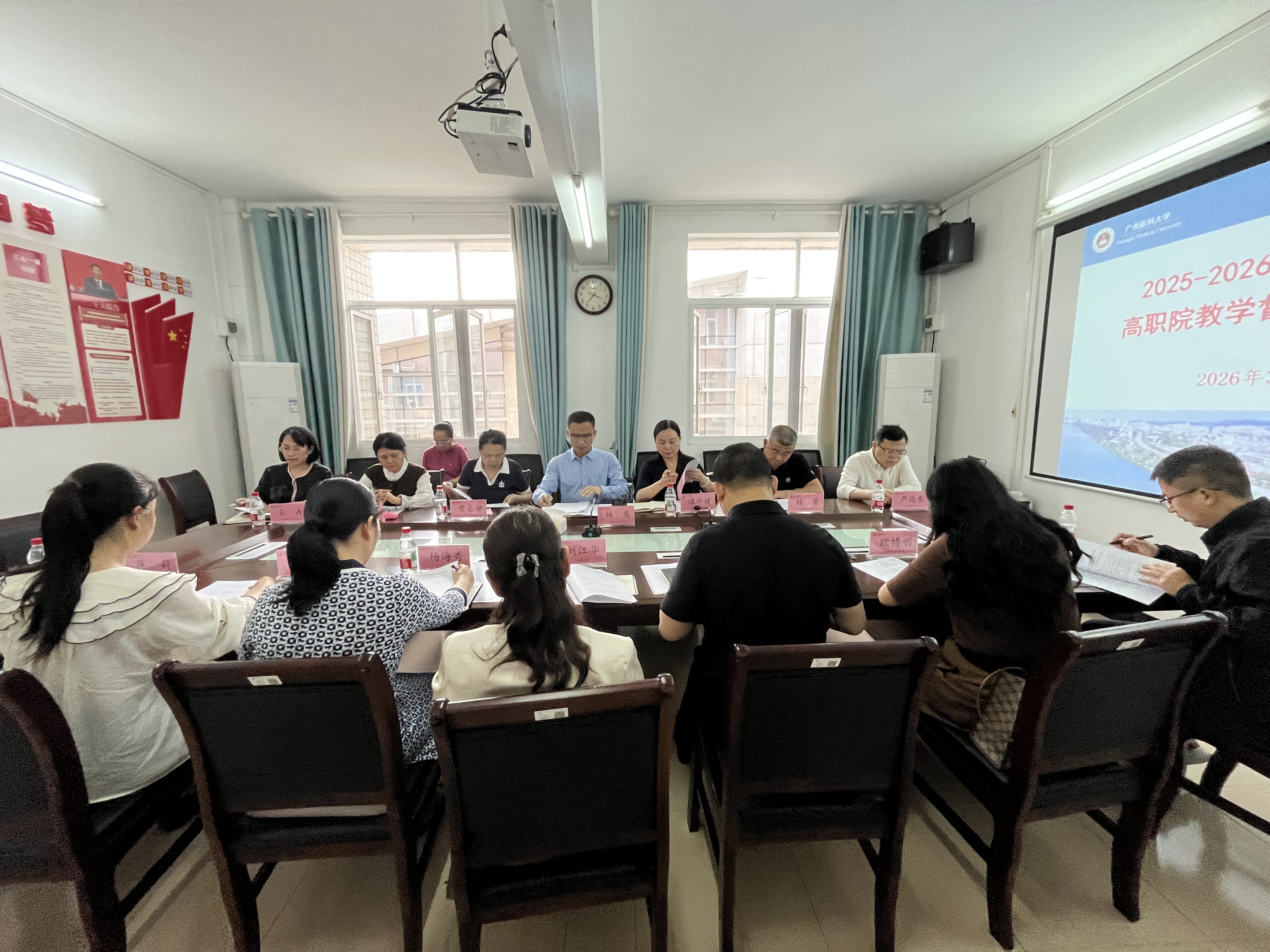 3月25日下午,高等职业技术学院在学院会议室召开2026年春季学期教学督导工作会议。学院副院长林展、谭珍媛,教务科全体人员,第五届高职教学督导组专家,相关二级学院及校外教学单位分管教学工作的领导参加了会议。会议由林展副院长主持。